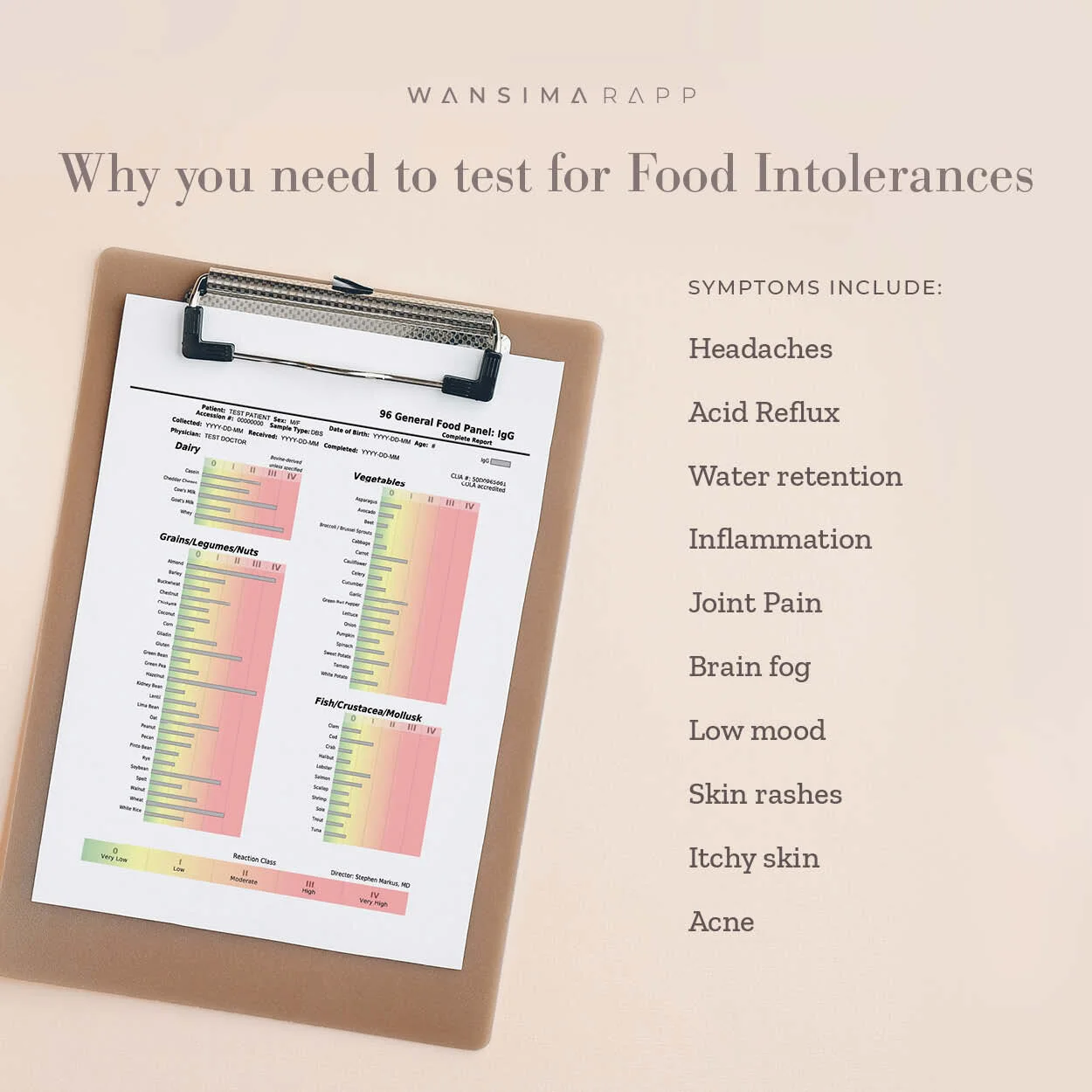 A food intolerance is not the same as an allergy where you have an instant reaction sometimes even fatal. A food intolerance or sensitivity is an IgG (Immunoglobulin G) response which is a delayed immune response action to a certain food. It’s where individual components of our food can’t be processed and assimilated by our digestive system. This response can cause inflammation and symptoms 24 - 72 hours after you consumed the food.